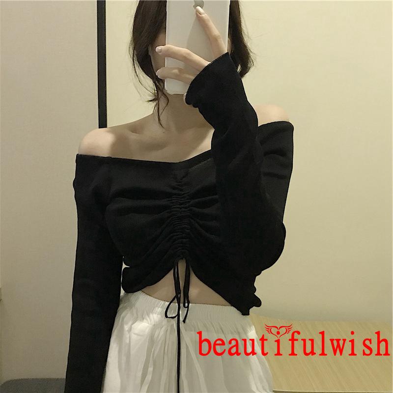 Blus Crop Top Rajut Off Shoulder Sabrina Lengan Panjang Gaya Korea Shopee Indonesia