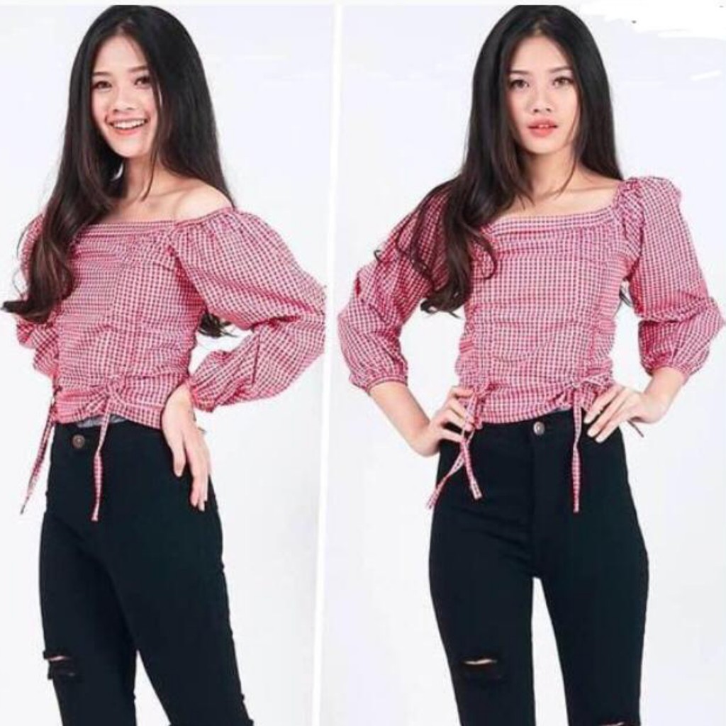 Atasan Wanita Serut Blouse Sabrina Crop Top Baju Fashion Korea Kekinian Blus Kotak Lengan Panjang Shopee Indonesia