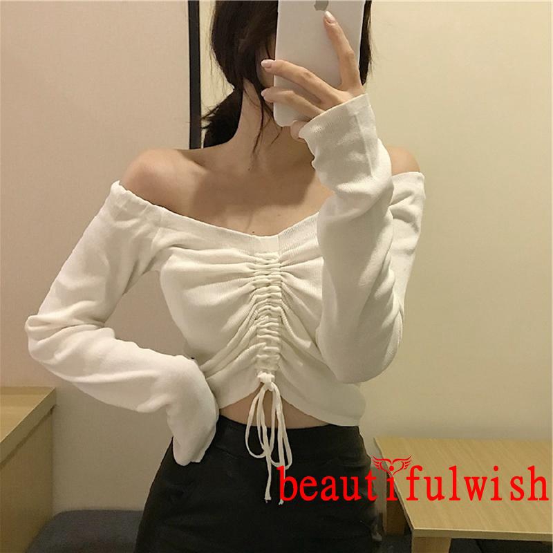 Crop Top Off Shoulder Sabrina Lengan Panjang Aksen Serut Depan Warna Polos Gaya Korea Untuk Wanita Shopee Indonesia